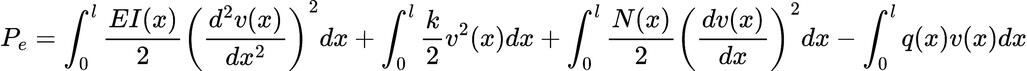 The undetermined coefficients are solved through minimization of the potential energy of the beam which is given by the equation below.